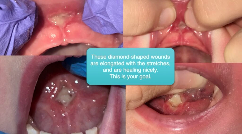 For the technique, you have to put firm pressure on the wound, like you were massaging someone’s back. Without sufficient pressure, the massages will not encourage the tissue to stop sticking back together. When we see the beginning signs of reattachment at the one-week follow up (90% are partially sticking back together even with stretches), parents are often not pushing with enough pressure or not pushing slowly and with pressure right in the middle of the scab and visualizing the diamond shape. At the follow-up visit, we demonstrate a stretch in the office again. We call it a “deeper stretch,” but it’s just a standard stretch. And the wound will often reopen with moderate pressure if done with the correct technique.