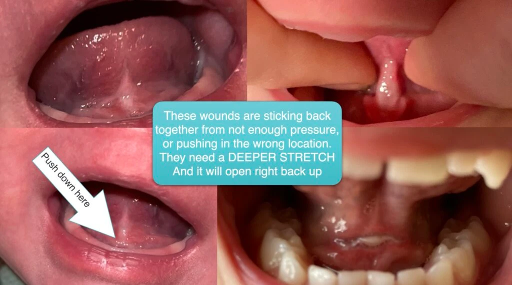 If the tongue sticks back together, as long as it’s been within a few weeks, a more firm, slow stretch can help it to open back up, and it does NOT need to be lased again. This is a common mistake among newer providers. First, the release provider should try a stretch before performing a second procedure (revision) with the laser. If after pushing on it and no movement or reopening occurs, then a better option to restore function is to laser it again. But stretches must be done with more pressure, an additional follow-up visit (or two), and three more weeks of stretches will be needed. Something must be changed since the first release, or the wound will readhere again – the definition of insanity -doing the same thing and expecting a different result.