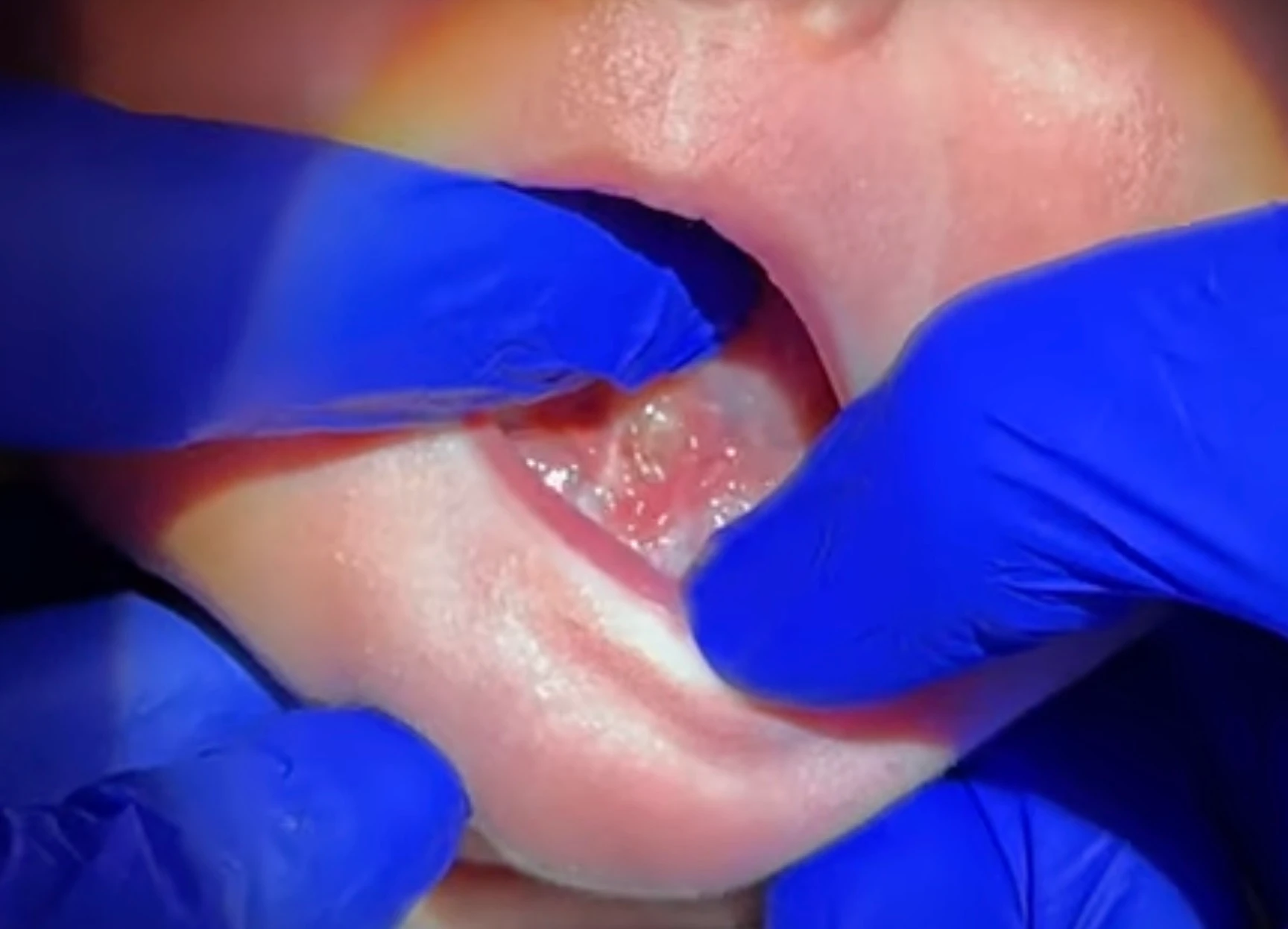 Push with the dominant hand’s index finger straight down behind the gum pad (or lower teeth if present), with the pad of the finger into the floor of the mouth. You have to work your way into the area under the tongue sometimes. Push down into the floor of the mouth, and as you are pushing down, SLOWLY scoop and slide the finger back (as you are still pushing down). You have to maintain pressure as your finger rides back and up the wound to elongate or stretch it out. You should wear a headlamp to see well; gloves make it easier, too. It’s like doing a Heimlich maneuver, scooping ice cream, or imagining a skateboarder on a half-pipe. Just push down. As you go down, keep pushing down slowly, and take your finger up the undersurface of the tongue and then hold it for around 5 seconds to see the diamond elongate.